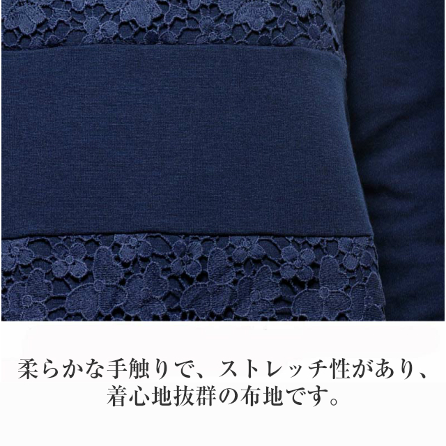 レースでさりげなく華やかに♪大人可愛いレース切替えチュニック。 フロントは愛らしい花モチーフ柄の刺しゅうレースを挟んでボーダー柄風にした新感覚のデザイン。 レース部分は当て布付なので透けません。 すとんとしたボックスシルエットで着やすいのも特長です。 のびのび動きやすいソフトなポンチ素材でラクな着心地です。 お尻がすっぽり隠れるデザインなので、気になる部分をカバーしてくれます。